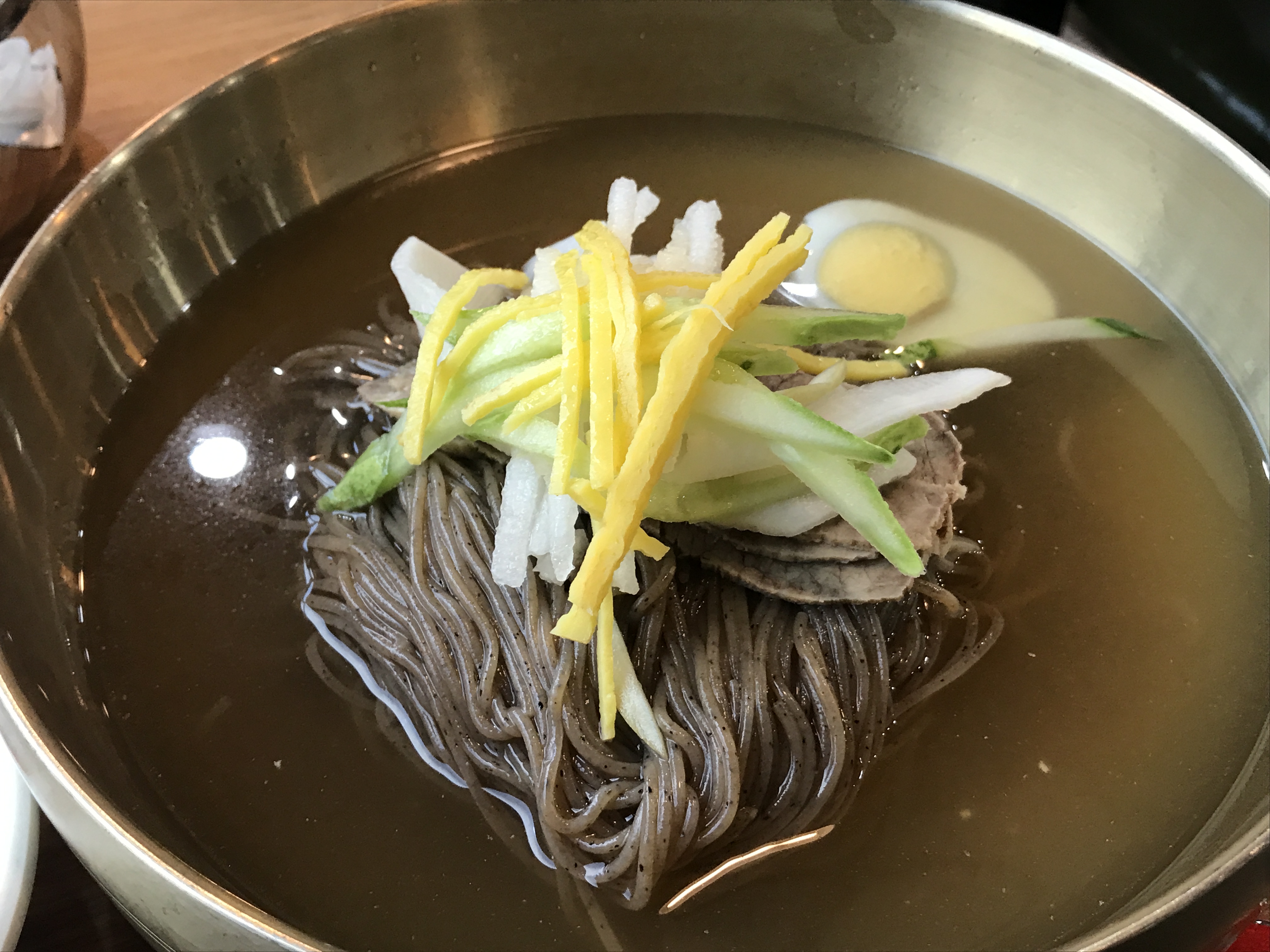 물냉면 : 일반적인 새콤달콤한 육수가 아니라 담백한 맛, 그러면서도 부족함이 없다. 면발은 쫄깃한 스타일이 아닌 질감이 약간은 거친 메밀면, 국물과 잘 어울린다. 9/10